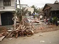 In Mae Sai, Thailand, one person died when a wall collapsed. Sixteen people, including seven Burmese and five Chinese nationals were also injured.[20] Buildings in the district cracked and the spire of an 11th-century stupa toppled. No structural collapses occurred but ground effects such as liquefaction and lateral spreading were observed. The MMI in Mae Sai corresponded to VI (Strong).[10] Shaking also caused panic in Chiang Rai and Bangkok.[21] In Hanoi, Vietnam, windows shattered and some people evacuated from their homes.[22] Strong shaking was felt in the provinces of Luang Namtha and Bokeo in Laos without casualties or damage. In Xishuangbanna Prefecture, Yunnan, some homes and schools cracked.[23] Tall buildings were temporarily evacuated in Chiang Rai, Menghai County, Nanning and Hanoi.[24][25]