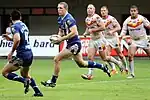 Wigan continued their winning streak at the Racecourse Ground in Wrexham over Crusaders RL, a result which took them to the top of the league table, tied on points with Warrington and Huddersfield.[62][63] The team's first Challenge Cup fixture against Barrow Raiders was their next match, and with Jack Hughes making his first-team debut, the Warriors whitewashed their opponents to advance into a fifth round meeting against Bradford later in the month.[64][65] Returning to Super League action, Thomas Leuluai, Sam Tomkins and Richards all scored braces on the way to a 52–6 win over Harlequins RL.[66] An ill-tempered fifth round Cup game at Bradford's Odsal Stadium was exemplified with Gareth Raynor's sending off in the first half for foul play as Sam Tomkins was scoring a try, however a Richards brace helped Wigan survive a late comeback to go through to the next round—a quarterfinal draw against Cup holders Warrington.[67][68] Sam Tomkins and Richards both scored hat-tricks against Hull Kingston Rovers as Wigan completed a perfect May record in their final match of the month.[69]