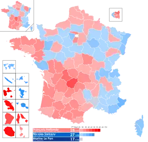 The first round ended with the selection of François Hollande and Nicolas Sarkozy as second round participants, as neither of them received a majority of votes cast in the first round. Hollande won the runoff with 51.64% of the vote to Sarkozy's 48.36%.[1] It was the second time in French history and the first time since the 1981 election that a President seeking reelection was denied a second term, and the only time the incumbent seeking reelection did not obtain the most votes in the first round.