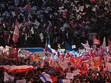 Since the first round there had been a drive to woo far-right voters[31] with Sarkozy making immigration a major issue of his campaign and Hollande focusing on the euro-zone crisis and the state of the economy.[32] Sarkozy's move to the right in embracing National Front themes such as stricter immigration has drawn criticism from prominent figures from his own party such as former Prime Ministers Dominique de Villepin, Jean-Pierre Raffarin, Alain Juppé and Senators Chantal Jouanno and Jean-René Lecerf.[33] There was more criticism of the German-led austerity measures by Hollande,[34] while he also responded to Sarkozy's words at a rally in Toulouse saying that "without borders there is no nation, there is no Republic, there is no civilisation. We are not superior to others but we are different." In turn Hollande told a bigger rally in Paris that "I want victory, but not at any price, not at the price of caricature and lies. I want to win over the men and women who are angry, a hundred times yes, but compromise myself? A thousand times no."[35] Sarkozy reiterated threats to withdraw from the Schengen Agreement if there was no tightening of border controls. He also said that there would be a presumption of self-defense when police are involved in the killing of suspects and criticised the EU's lack of mention of Europe's Christian roots in its constitution. Many of the issues were similar to that of the National Front, from which Sarkozy's UMP gained votes between the 2002 and 2007 election. He further spoke "to those French who stay home, don't complain when Francois Hollande is elected and regularizes all illegal immigrants and lets foreigners vote."[36]
