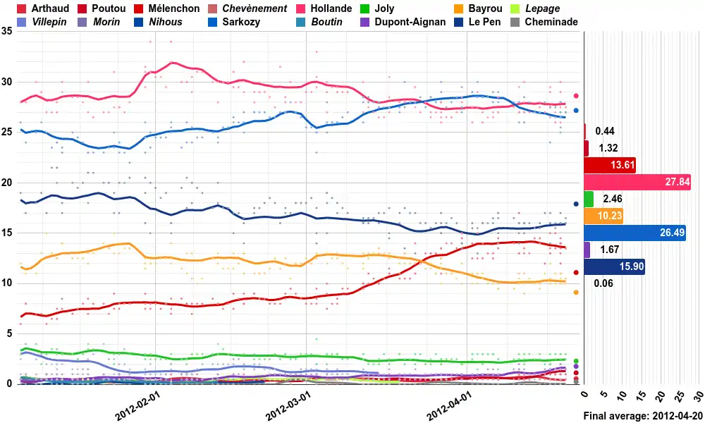 In order to qualify for the first round of voting, a candidate had to collect the signatures of at least five hundred elected representatives among a total of more than 47,000; these could be mayors, general councillors, regional councillors, deputies, senators, members of the European Parliament elected in France.[3] The number of signatures per candidate is not released, but five hundred signatories for each candidate are chosen randomly and their names are published.[4] Ten candidates qualified in 2012:[5]