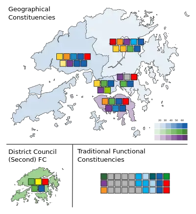 While the electoral methods in the 30 'traditional' FC seats remain unchanged, the five new seats form a new constituency called the District Council, for which candidates may be nominated by the District councillors and are elected by all registered voters who are not in any 'traditional' FC,[8] creating the largest constituency with a total of more than 3.2 million eligible electors.[9] The vote counting system used is the same as that in the GCs: the party-list proportional representation with the largest remainder method and Hare quota.