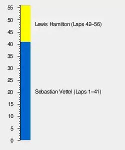 At the start, Vettel led from pole position and Webber passed Hamilton before entering the first corner. Alonso made a good start to gain 3 places.[43] Vettel opened up a lead over Webber before Hamilton passed the Australian in the DRS zone on the long straight from T11 to T12 on Lap 4. Webber would later retire on Lap 17 when KERS shut down and eventually the alternator failed on the Red Bull car.[44] Vettel would pit on Lap 22 but retained the lead over Räikkönen, Hamilton, Massa, and Alonso. Hamilton was able to catch and pass Vettel on Lap 42 in the DRS zone and kept the lead into turn 12. McLaren's Lewis Hamilton would go on to win the race, his last win for McLaren, followed by Red Bull's Sebastian Vettel and Ferrari's Fernando Alonso.[45] Bruno Senna scored his final Formula One point.