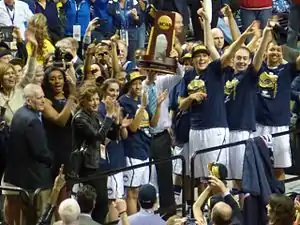 UConn team with championship trophy 2014, on the floor in Nashville, shortly after winning the game and receiving the Championship trophy.