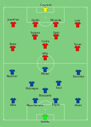 In the second leg, played on 28 August at the Camp Nou, Lionel Messi missed a penalty for Barcelona in the 89th minute, hitting his shot against the crossbar after Miranda had bundled substitute Pedro over in the area.[5] Atlético Madrid had two players sent off: Filipe Luís in the 81st minute for tangling with Dani Alves, and Arda Turan, who had already been substituted, in the first minute of added time for protesting a decision.[6] Barcelona won the cup for a record 11th time on the away goals rule.[7][8]