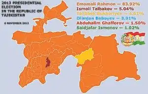 Presidential elections were held in Tajikistan on 6 November 2013.[1] Incumbent President Emomali Rahmon was re-elected with a reported 84% of the vote on a turnout of 86.6%.[2]