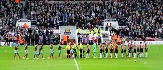 In April 2014, United announced that they had agreed a deal with German sportswear company Adidas to produce the team kit for the 2014–15 season and beyond, ending the club's previous association with Macron.[1] This was followed in June with DBL Logistics being unveiled as the club's secondary shirt sponsor until 2016,[2] and in July by the announcement of luxury car dealers, John Holland Sales as the club's main shirt sponsor.[3] In September United released a third kit, featuring a yellow and black shirt, sponsored by Topspring.[4] On 17 October, Sheffield United announced a two-year deal with local business Blue Portal Telecoms with their logo appearing on the shorts of the first team.[5]