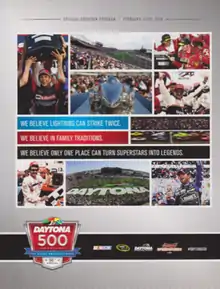 The program for the 2014 Daytona 500, showing iconic wins, including Trevor Bayne's win in 2011, Dale Earnhardt's in 1998, and Jimmie Johnson's in 2013.