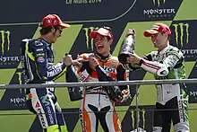 Valentino Rossi, Marc Márquez and Álvaro Bautista, toasting the champagne on the podium after finishing second, first and third in the MotoGP race.
