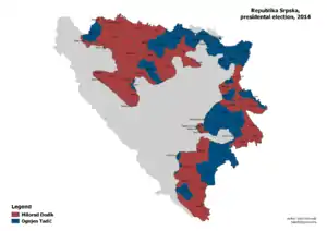 General elections were held in the Republika Srpska entity of Bosnia and Herzegovina on 12 October 2014 as part of the Bosnian general elections.[1] Incumbent President Milorad Dodik was re-elected, running on a joint Alliance of Independent Social Democrats–Democratic People's Alliance–Socialist Party platform, whilst his Alliance of Independent Social Democrats remained the largest in the National Assembly.