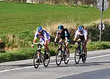 Over the next 70 kilometres (43 miles), the breakaway continued to build their lead over the peloton; with 100 kilometres (62 miles) to race, they had a lead of around six minutes, although Dal Col was dropped.[16] Shortly afterwards, the peloton climbed the Taaienberg, where Daniel Oss (BMC Racing Team), Matteo Trentin (Etixx–Quick-Step) and Matti Breschel (Tinkoff–Saxo) attacked and were soon joined by Tiesj Benoot (Lotto–Soudal). This breakaway was soon brought back by Team Katusha. Nairo Quintana was dropped during this period of racing and abandoned the race.[14] Tinkoff–Saxo, along with Team Sky, took up the chase in earnest and reduced the breakaway's lead to under two and a half minutes with 67 kilometres (42 miles) left. BMC Racing Team joined in the chase and halved the lead over the next 20 kilometres (12 miles). Van Ginneken was dropped, leaving three riders in the leading group.[16]