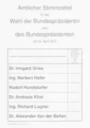 - 1 2 Österreich, vorläufiges Endergebnis inklusive Briefwahlstimmen. Archived 23 May 2016 at the Wayback Machine Bundesministerium für Inneres (in German). Retrieved 10 December 2016.