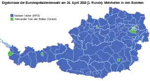 - ↑ "Bundespräsidentenwahl 2016 – Gesamtergebnis inklusive Verlautbarung der Bundeswahlbehörde". Bundesministerium für Inneres (in German). 2 May 2016. Retrieved 23 May 2016.