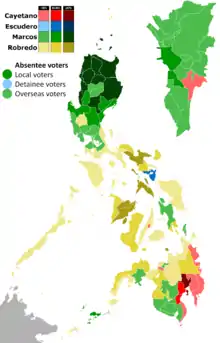 1. 1 2 3 Cayetano, Marcos and Trillanes are all members of the Nacionalista Party, but failed to get that party's nomination; instead, all of them ran as independents.