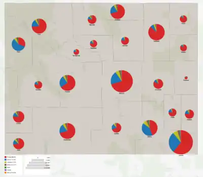 Results by county showing number of votes by size and candidates by color