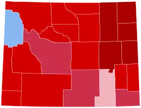 Donald Trump won the election in Wyoming with 67.4% of the vote. Hillary Clinton received 21.6% of the vote. Gary Johnson of the Libertarian Party received 5.1%.[2] Wyoming, a solidly Republican state, has not voted for a Democrat in a presidential election since it went for Lyndon B. Johnson in 1964. Trump carried every county with the exception of Teton County. His 46.3-point margin over Clinton not only made Wyoming the most Republican state in the 2016 election,[3] but also the largest margin of victory by any presidential candidate in the state's history, besting Ronald Reagan's 42.3-point margin in 1984, though Ronald Reagan won the highest percentage in the state in 1984, winning an astonishing 70.5% of the vote. Clinton's 21.88% vote share was the lowest of any major party presidential nominee in Wyoming history.