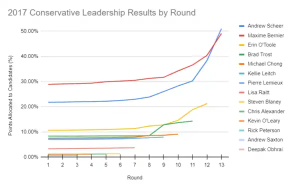 259,010 party members were eligible to vote in the leadership contest.[4] 141,000 members cast a vote. According to raw voting figures, Scheer received 62,593 votes on the final ballot compared to 55,544 votes for Bernier with 23,000 voters who had voted in the first round ranking neither Scheer or Bernier in their ranked ballot. Votes were apportioned among ridings so that each riding was allocated 100 points, regardless of the number of voters, resulting in 17,222.20 points (50.95%) for Scheer and 16,577.80 points (49.05%) for Bernier.[5]