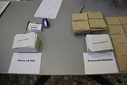 The first round was held under a state of emergency that was declared following the November 2015 Paris attacks.[1] Following the result of the first round, Macron and Le Pen continued to the 7 May runoff.[2] It was the first time since 2002 that a National Front candidate continued to the second round and the first time in the history of the Fifth Republic that the runoff did not include a nominee of the traditional left or right parties;[3] their combined share of the vote from eligible voters, at approximately 26%, was also a historic low.[4]