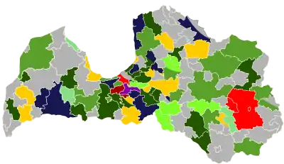 The following map shows the results of the local elections in different territories of Latvia. The colour, which each territory has, indicates the party, which received the majority of votes in this territory.