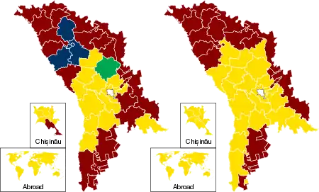 ![]() Second round results by electoral commission Sandu: 50–55% 55–60% 60–65% 65–70% 70–75% 80–85% 90–95% Dodon: 50–55% 55–60% 60–65% 65–70% 70–75% 80–85% 85–90% 90–95% | ||||||||||||||||