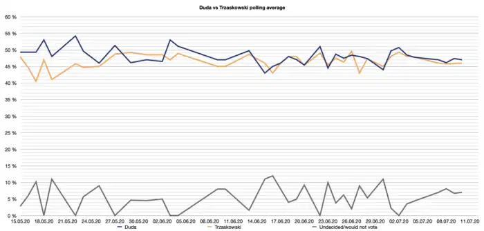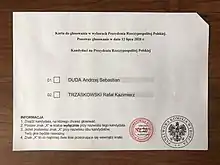 Presidential elections were held in Poland on 28 June 2020. As no candidate received a majority of the vote, a second round was held on 12 July, in which incumbent president Andrzej Duda, running with the support of Law and Justice,[1] faced off against Civic Platform vice-chairman and Mayor of Warsaw Rafał Trzaskowski. Results from the second round of voting, announced by the National Electoral Commission (PKW) on 13 July, indicated that Andrzej Duda had won re-election with 51.03% compared to Rafał Trzaskowski's 48.97%.[2]