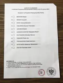 On 29 April 2020, 11 days before the planned election date, election candidate Stanisław Żółtek presented a copy of an electoral ballot at a press conference.[26][27] The copies contained the names of all the candidates and other forms to be filled by voters. Żółtek said that he received the ballots from workers of one of the companies that was printing and preparing electoral documents. Poczta Polska notified the Internal Security Agency about the leak. As of 2 May 2020, Polish law did not authorise Poczta Polska to organise postal voting except in a small number of special cases.[26]