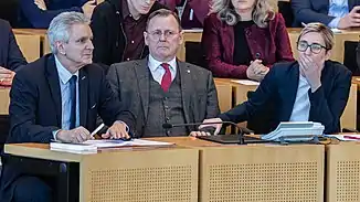 In the CDU, the electoral behaviour of the Thuringian state association made the internal party differences in dealing with the AfD particularly clear. CDU state chairman Mike Mohring had initially defended the election of Thomas Kemmerich despite massive criticism.[107] After a visit by the CDU presidium in Erfurt, he announced his resignation as CDU faction chair.[108] It was not known whether Mohring actively supported Kemmerich's election.[109] On 2 March 2020, Mario Voigt was elected the new parliamentary party leader of the CDU Thuringia.[110] Mohring also relinquished the chairmanship of the state CDU association.[111][112]