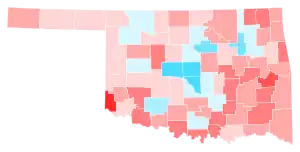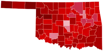 Trump easily carried Oklahoma on Election Day by a margin of 33.08%, down from 36.39 points in 2016. Oklahoma was one of two states where Trump won every county, the other being West Virginia. This also signaled the fifth consecutive election in which the Republican candidate carried every county in the state, including those counties encompassed by Native American reservations. In this election, Trump also became the first presidential candidate ever to win more than a million votes in Oklahoma.[4] Biden, however, came within 3,326 votes of winning Oklahoma's most populous county Oklahoma County, and won more than 40% of the vote in Oklahoma's second-most populous county Tulsa. No Democratic presidential candidate has won Oklahoma County since Lyndon B. Johnson in his 1964 landslide, or Tulsa County since Franklin D. Roosevelt in his 1936 landslide. This is the first election since 2000 in which not every county voted in the majority for the Republican. However, these gains in urban Oklahoma were offset by continued falloff in southeast Oklahoma, where Biden even underperformed Hillary Clinton's performance four years earlier in most counties.