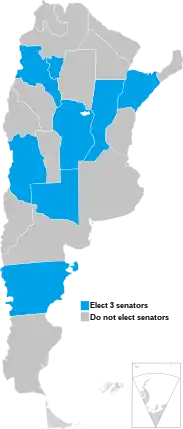 The 72 members of the Senate are elected in the same 24 constituencies, with three seats in each. The party receiving the most votes in each constituency wins two seats, with the third seat awarded to the second-placed party.[25] The 2021 elections will see one-third of Senators renewed, with eight provinces electing three Senators; Catamarca, Chubut, Córdoba, Corrientes, La Pampa, Mendoza, Santa Fe and Tucumán.[24]
