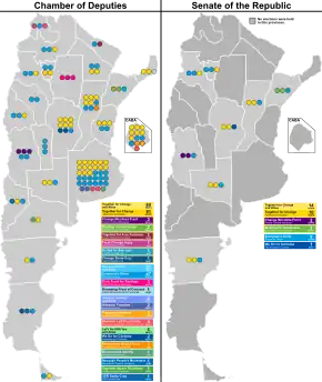 127 out of 257 seats in the lower chamber were renewed, while eight provinces (Catamarca, Chubut, Córdoba, Corrientes, La Pampa, Mendoza, Santa Fe and Tucumán) each renewed their 3 senators, in total accounting for 24 out of 72 seats in the upper chamber.[2]