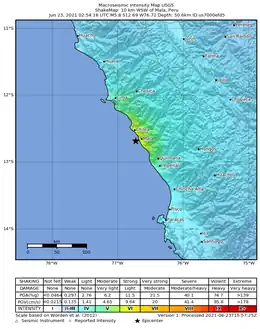 The 2021 Mala earthquake, with a Richter magnitude of 6.0 and moment magnitude of 5.9, struck on June 22, 2021, at 21:54:18 local time (UTC-5) with an epicenter off the coast of Mala in the department of Lima.[7][8] Following the main event, there were more than 15 aftershocks, with the largest being a magnitude 4.8 event at 07:03 local time on June 23.