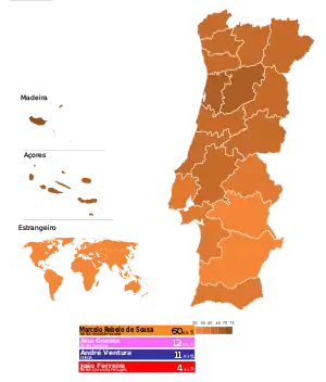 The election was held during the COVID-19 pandemic, and Portugal was under a lockdown as of election day.[2] President Marcelo Rebelo de Sousa was reelected by a landslide, winning 60.7% of the votes.[3] He won every district in the country and all 308 municipalities, a result which happened for the first time ever in Portuguese democracy; he won 3,083 parishes out of 3,092.[4] The election also marked the rise of right-wing candidate André Ventura, leader of CHEGA, who polled 3rd with almost 12% of the votes.[5] In second place, former MEP and Ambassador Ana Gomes was able to win 13% of the votes, the best result ever for a female candidate in a presidential election.[6] The rest of candidates did not receive above 5% each.