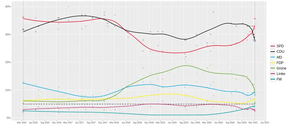 | Infratest dimap | 1–3 Mar 2021 | 1,186 | 30 | 28 | 9 | 9 | 12 | 3 | 5 | 4 | 1 |