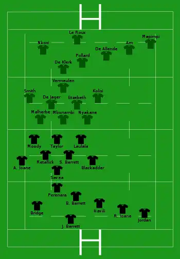 | Try: Mbonambi 27' m Marx (2) 58' c, 71' m Con: Pollard (1/2) 59' Pen: Pollard (3/5) 5', 11', 45' | Report | Try: Kellaway 16' c Con: Cooper (1/1) 17' Pen: Cooper (7/7) 7', 13', 32', 40', 52', 62', 80+1' |