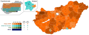 | United for Hungary | 1,947,331 | 34.44 | 38 | 1,983,708 | 37.09 | 19 | 57 | –8 | |
