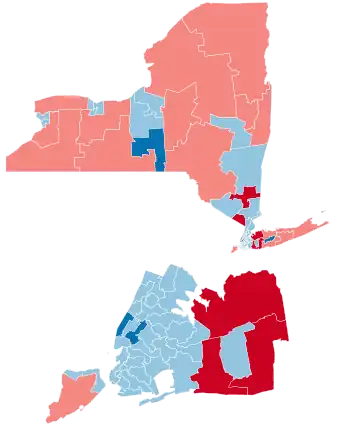 Note: Two districts in New York City are marked as democratic gains because they are newly created districts, not because they switched parties. Two upstate districts, both held by Republicans, were eliminated due to population shifts.