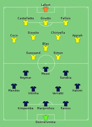 - ↑ Each team was given only three opportunities to make substitutions, excluding substitutions made at half-time.