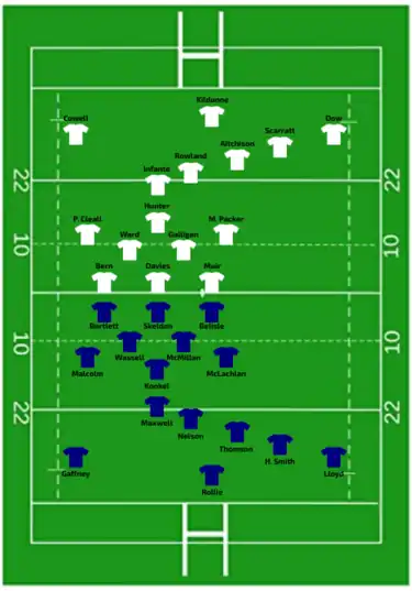 | Try: Rollie 15' m | Report | Try: M. Packer (3) 8' c, 29' m, 64' m P. Cleall 12' c Cowell 21' m Dow 24' c Infante 41' c Aitchison 52' c Powell 62' c Con: Scarratt (5/7) 8', 13', 26', 42', 52' Rowland (1/2) 63' |
