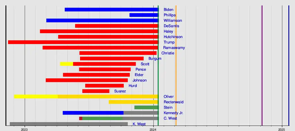 Kanye West 2024 presidential campaignCornel West 2024 presidential campaignRobert F. Kennedy Jr. 2024 presidential campaignJill SteinMichael RectenwaldChase OliverFrancis X. Suarez 2024 presidential campaignWill Hurd 2024 presidential campaignPerry Johnson 2024 presidential campaignLarry Elder 2024 presidential campaignMike Pence 2024 presidential campaignTim Scott 2024 presidential campaignDoug Burgum 2024 presidential campaignChris Christie 2024 presidential campaignVivek Ramaswamy 2024 presidential campaignDonald Trump 2024 presidential campaignAsa Hutchinson 2024 presidential campaignNikki Haley 2024 presidential campaignRon DeSantis 2024 presidential campaignMarianne Williamson 2024 presidential campaignDean Phillips 2024 presidential campaignJoe Biden 2024 presidential campaign