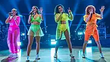On 27 February 2021, the band made their first performance in a decade on the Das Erste music show Schlagerchampions – Das grosse Fest der Besten, hosted by singer Florian Silbereisen, where they performed "Daylight in Your Eyes."[33] Following a short hiatus, the band reunited on 28 May 2021 to perform a medley of the celebration versions of "Daylight in Your Eyes", "Rivers of Joy" and "There Must Be an Angel" at the season finale of the dance competition television series Let's Dance.[34] The performance was largely panned by critics, who criticized the band for singing lip sync.[34] On 4 June 2021, No Angels played a live streaming concert on RTL Deutschland's website rtl.de. A mini-concert consisting of "There Must Be an Angel", "Still in Love with You", "Rivers of Joy", "A New Day" and "Daylight in Your Eyes," the broadcast was interrupted by a storm front across Cologne only minutes after their performance.[20] Two days later, the band performed "Still in Love with You" and "Daylight in Your Eyes" on ZDF-Fernsehgarten, broadcast live from the grounds of the ZDF broadcasting centre at Mainz.[35] On 17 June, No Angels appeared on Die Carolin Kebekus Show where they sung a shortened version of "Still in Love with You" and performed a girl band medley along with host Carolin Kebekus.[36] On 24 July 2021, No Angels appeared on Gottschalks große 90er-Show where they performed a live version of the Spice Girls' "Too Much" (1997).[37] Following another break, the band reteamed in fall 2021 to perform the winter version of "When the Angels Sing" on Das Adventsfest der 100.000 Lichter, broadcast on 27 November.[38]