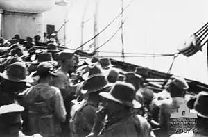 The 21st Battalion was raised at Broadmeadows, Victoria, in February 1915 as part of the formation of the 6th Brigade, 2nd Division. A unit of the First Australian Imperial Force (AIF), it was raised from volunteers for overseas service that were drawn from all over Australia.[2] After training at Broadmeadows and Seymour Camps in Victoria, the battalion left for Egypt. Arriving there in June 1915, it undertook further training before being dispatched as reinforcements to Gallipoli in late August. En route the battalion's transport, HMT Southland, was torpedoed by German submarine UB-14 near Lemnos and the passengers and crew were forced to abandon ship. Nevertheless, the 21st Battalion eventually arrived at ANZAC Cove on 7 September. Following this they undertook mainly defensive duties along the Australian line until December 1915, when they were evacuated from Gallipoli after the decision was made to withdraw Allied forces from the peninsula.[2] One 21st Battalion soldier who was killed during the Gallipoli campaign, Private James Martin, who was only 14 years and nine months old, is believed to have been the youngest Australian soldier killed during the war.[3]
