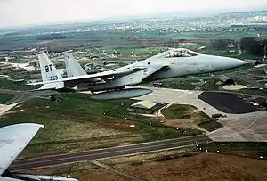 After the Invasion of Kuwait by Iraq in August 1990, the squadron was put on heightened readiness status awaiting possible deployment to the Gulf Region. At the time of the invasion, the 22nd Fighter Squadron was involved in the MSIP (Multi-Stage Improvement Program)[5] upgrade of their F-15s and could not be deployed as a coherent unit. During December 1990, those aircraft that had completed upgrades, along with pilots and maintainers from the 22nd AMU (Aircraft Maintenance Unit), augmented their sister squadron, the 53rd Tactical Fighter Squadron, for deployment to Al Kharj AB, Saudi Arabia in support of Operations Desert Shield and later Desert Storm. In January 1991, many of the remaining aircraft, pilots and maintainers from the squadron deployed to Incirlik AB, Turkey along with their other sister squadron, the 525th Tactical Fighter Squadron, and the F-15s of the 32nd Tactical Fighter Squadron from Soesterberg AB, The Netherlands. Despite their reduced numbers, the 22nd's remaining pilots and maintainers at Bitburg continued to provide aircraft for the Zulu Alert facility, as well as provided support for non-squadron F-15s en route to the war zone. In all locations, the aircraft and personnel of the 22nd Tactical Fighter Squadron performed amazing feats under demanding conditions. Not a single F-15 aircraft was lost in combat during the war and several returned with credited kills. Aircraft tail number 79-0078, one of the squadron's Al Kharj deployed aircraft, was credited with two Mig-21 kills on 6 February 1991. Aircraft tail number 79-0022, one of the squadron's aircraft deployed to Incirlik, was credited with a Mig-23 kill on 28 January 1991 and is currently on display, along with other squadron memorabilia, at the Pueblo Weisbrod Aircraft Museum in Pueblo, Colorado. In March 1991, the Incirlik-deployed squadron returned to Bitburg AB.[3] They were followed by the last members of the Al Kharj deployment in July 1991.