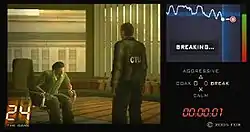 24's minigames serve as interludes from the main mission, and are primarily interrogation sequences or computer puzzles. They are presented both as single puzzles in third-person missions, and as timed stand-alone missions.[1] The computer puzzles include maze puzzles, where a player must select a coloured path from a starting box to an ending box and sometimes a second and third box, are used to represent bypassing locks and other computer functions. Letter sequence puzzles, where a player swaps adjacent pairs of a series of random letters until they are in the correct sequence, are used to represent code-breaking such as for encrypted files or a locked door. Colour/symbol matching puzzles, where a cursor randomly moves across a field of coloured squares and the player must press the controller button that corresponds to that coloured square, are used to represent unscrambling files from hard drives and other similar functions. A number of other puzzles are used only once, including puzzles to simulate transferring files over a damaged network, infrared scanning of buildings, radar-like scanning of areas, and creating a network link across the entire planet.[5]