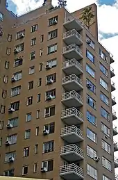 About 100 apartments have open-air balconies.[13][45] These balconies have an average floor area of 8 by 8 feet (2.4 by 2.4 m) and are cantilevered from the windows.[16][34] The balconies are concrete slabs and largely retain their original metal railings as of the early 21st century.[32]