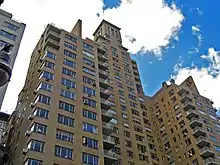 240 Central Park South occupies about half of its land lot.[13][24][25] The building is largely C-shaped in form and contains two primary sections, a 28-story section on Central Park South and a 15-story section on 58th Street, connected by the lobby running along Broadway.[13][24] Atop the main roofs of each apartment block are placed chimneys and water towers.[26][16][27] 240 Central Park South is variously quoted as having either 325,[24] 326,[16][27] or 327 apartments across its two apartment blocks.[28][lower-alpha 2]
