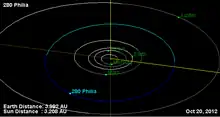 Philia (minor planet designation: 280 Philia) is a fairly large Main belt asteroid.[2] It was discovered by Johann Palisa on 29 October 1888 at the Vienna Observatory.