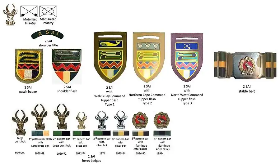 2 SAI was established on 1 January 1962, at Walvis Bay an enclave of South Africa surrounded by South-West Africa (Namibia).[1] The first officer to command the battalion was Major G.N. Mcloughlin and the first RSM was WO1 J.A.J. Steenkamp.[1] Initially the base consisted of tents, but was later replaced by prefabricated buildings.[1] Basic training took place in the desert and running up Dune 7 became part of that regime.[1]
