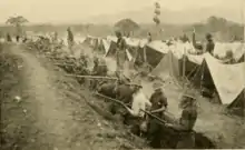 As a result of President William McKinley's call for volunteers to fight in the Spanish–American War on 23 April 1898, Massachusetts was given a quota of four regiments. The colonel of the 2nd Infantry Regiment of the Massachusetts Volunteer Militia, Embury P. Clark, was given authority by the state to raise a regiment on 29 April, with preference being given to militia enlistments; it was brought up to strength by recruits not already in the militia. The core of the regiment was formed by the twelve companies of the 2nd Infantry,[1] whose armories were located across Massachusetts – Companies A, C, and H were at Worcester, Companies B, G, and K at Springfield, Company D at Holyoke, Company E at Orange, Company F at Gardner, Company I at Northampton, Company L at Greenfield, and Company M at Adams.[2] The regiment reported to the state camp ground at South Framingham, designated Camp Dewey, on 3 May, and mustered into Federal service as the 2nd Massachusetts Volunteer Infantry between 8 and 10 May,[3] numbering 47 officers and 896 enlisted men.[4]