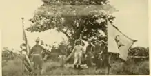 The regiment fought in the Battle of El Caney on 1 July.[4] The regiment, along with the 9th Massachusetts and the 71st New York, was among three state volunteer regiments to fight in combat during the Santiago Campaign and the only one to fight at El Caney.[8] During the engagement, the brigade, commanded by Brigadier General William Ludlow, was positioned southwest of the village of El Caney next to the main road. The regiment was armed with the black powder burning single-shot .45-caliber Springfield rifle, whose smoke revealed their positions to Spanish troops. Clark later wrote that no unit had ever gone into combat under worse conditions, as 55% of his men were untrained recruits.[9] The 2nd Massachusetts was ordered to halt its advance and instead hold its positions by Ludlow due to the inferiority of its armament.[10] The regiment lost one officer killed and three wounded, and four enlisted men killed in action, three died of wounds, and 33 wounded.[11]