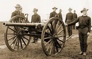 This weapon was the workhorse light artillery piece of the Spanish–American War and the Philippine–American War from 1898 to 1902. At least 16 were deployed to Cuba in the former conflict. It was also used in the China Relief Expedition in 1900.[1] Beginning in 1902 the 3.2-inch gun was largely replaced in combat units by the 3-inch M1902 field gun. However, 3.2-inch guns lingered in reserve and training roles. During World War I, the Army primarily used the French 75 mm gun instead of its own designs, which were mostly kept in the United States for training. The 3.2-inch guns were declared obsolete and almost all were scrapped beginning in 1919.[1]